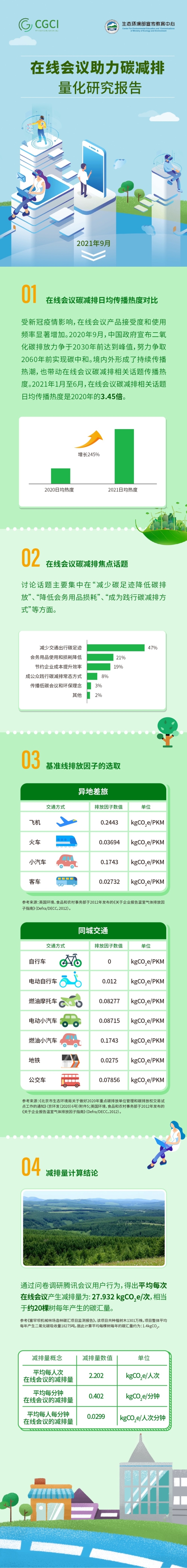 当天,中华环保联合会绿色循环普惠专委会与生态环境部宣传教育中心联合发布《在线会议助力碳减排量化研究报告》(以下简称《报告》)。《报告》以腾讯会议发放的问卷调研为样本,研究得出绿色办公之在线会议场景的碳减排量。研究结果显示,平均每次在线会议产生的减排量为27.932kgCO2e/次,每人次在线会议产生的减排量为2.202kgCO2e/人次。