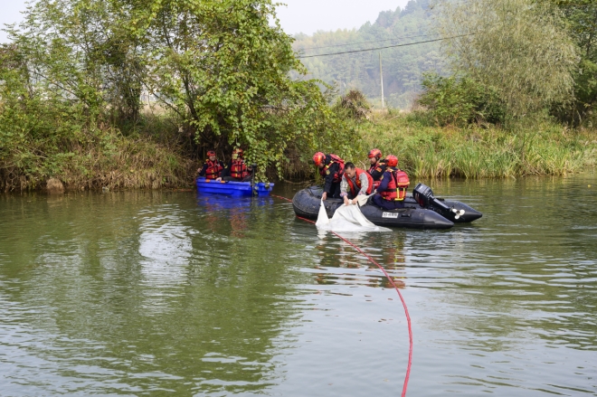本次演练模拟场景为2021年11月19日上午9时16分,邵东市S336桐江二桥处车辆侧翻发生交通事故并有汽油泄漏至桐江河内,泄漏的汽油有扩散趋势,情况比较紧急,不及时处置可能影响水源地水质危及下游桐江饮用水水质安全,并影响到下游市自来水公司取水作业。演练开始后,现场群众立即拨打110电话报警、120急救,并立即报告当地政府(周官桥乡人民政府),周官桥乡人民政府立即开展先期处置,向邵阳市生态环境局邵东分局通报突发环境事件信息。接到突发环境事件报告后,邵阳市生态环境局邵东分局立即启动预警及应急响应,成立以邵阳市生态环境局邵东分局局长为指挥长、分管执法副局长为常务副指挥长的现场指挥部,下设综合协调组、现场调查组、污染处置组、后勤保障组、应急监测组,多部门协调联动,立即奔赴一线,有序开展人工和无人机飞航排查,污染物拦截、收集和转移,特征污染物监测,舆情监控等工作。经过一系列的有力措施,事态得到控制,污染消除,水质安全得到有效保护,本次突发生态环境事件应急演练圆满结束。